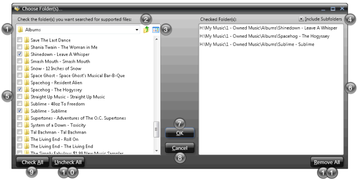 N/A | Folder Selection List | Shows a list of folders that correspond to the Current Folder Location. Check the boxes to the left of the folder names to add the folder to the Checked Folder List. All checked folders will then be searched for supported files that will be added to the Album List after clicking OK. | ||